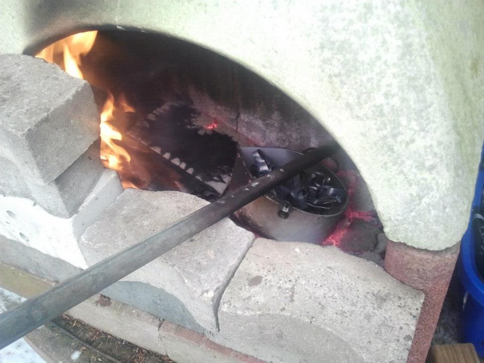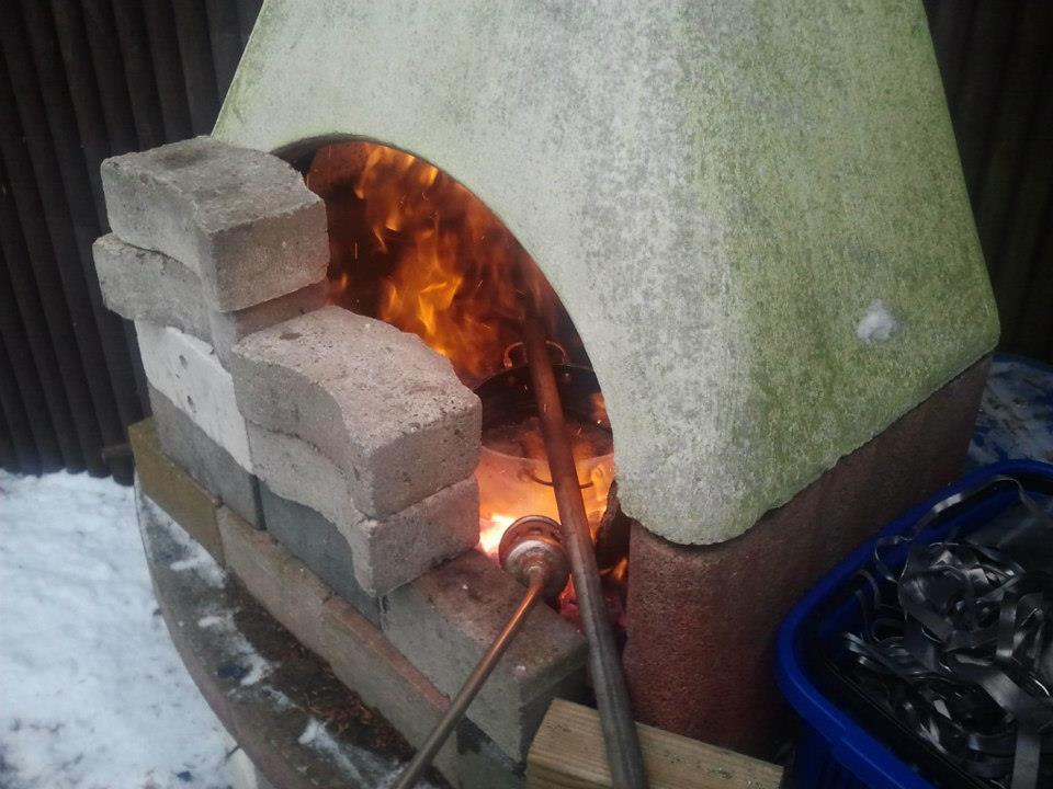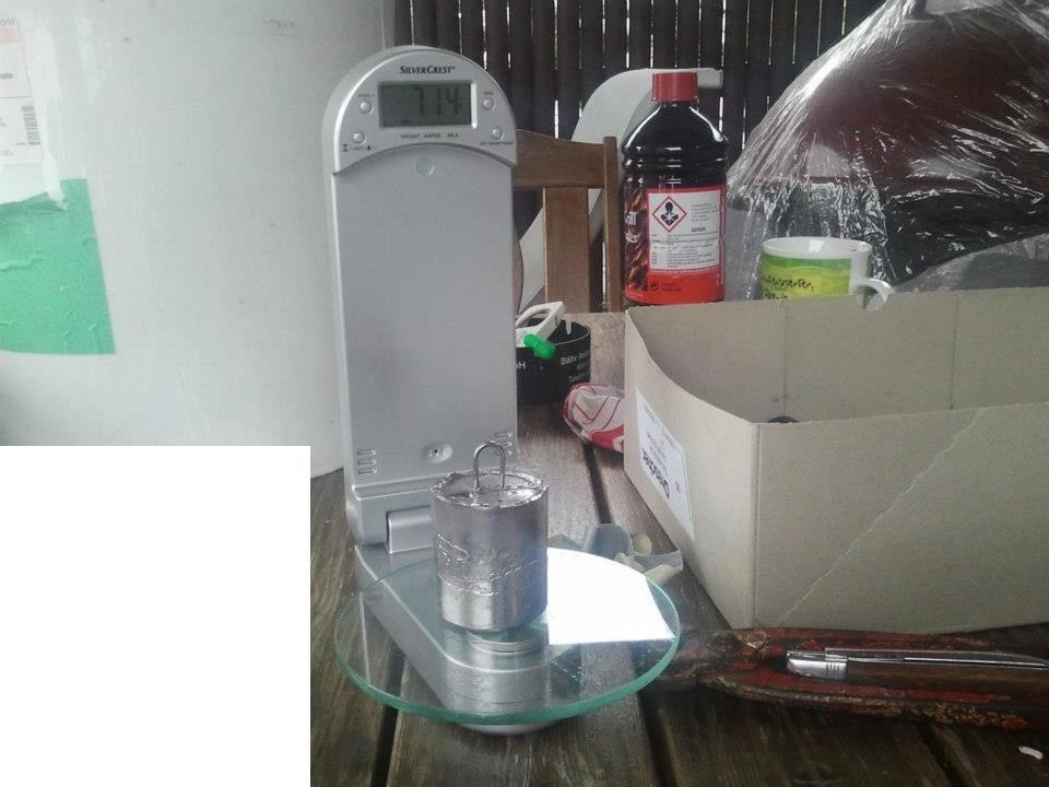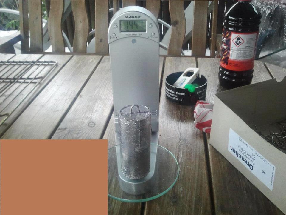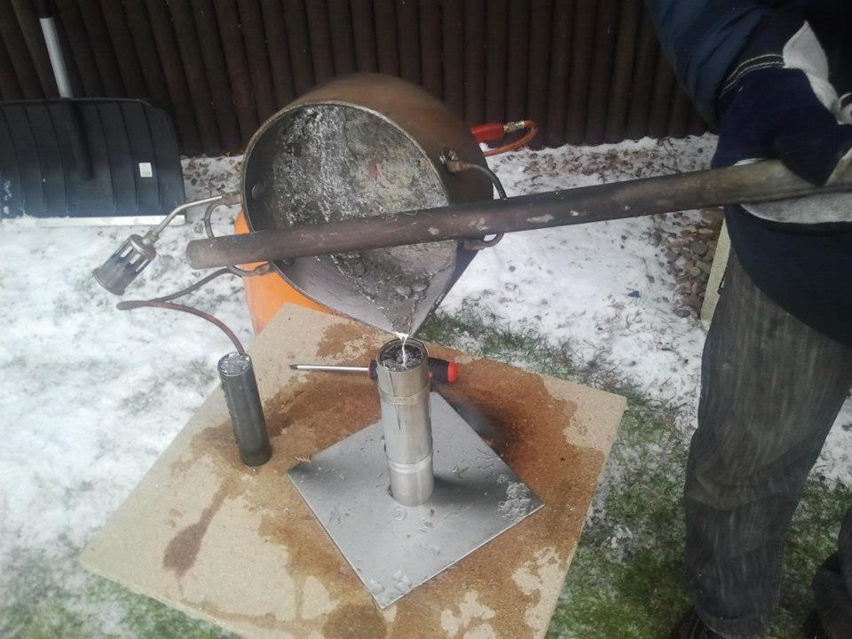 Im Vorfeld hatten Björn, Mark und Jens Reste von Dachdeckerblei und Lötzinn zusammengesammelt. Insgesamt waren das ca. 25 kg…also genau um jede Menge schwere Bleie zu gießen. Die Form dafür wurde aus einem längst aufgeschnittenen Edelstahl-Rohr in Eigenarbeit hergestellt (die Bauanleitung dazu gibt es in Kürze hier im Newsblog). Diese Form wurde mittels einem verstellbaren Boden (mit Aufnahme für eine Drahtöse) so konstruiert, dass die Bleie in allen Gewichtsklassen hergestellt werden können. Die nötige Hitze wurde in einem Grillkamin hergestellt. Als Grundlage diente normale Holzkohle die zusätzlich mit Feuerholz und einem Brenner angeheizt wurde. Das Blei befand sich in einem Edelstahltopf mit angeschweißter Griffstange. Sobald das Blei und einen Anteil Zinn (für die Festigkeit) geschmolzen war, wurde das Blei vorsichtig in die vorbereitete Form gefüllt.