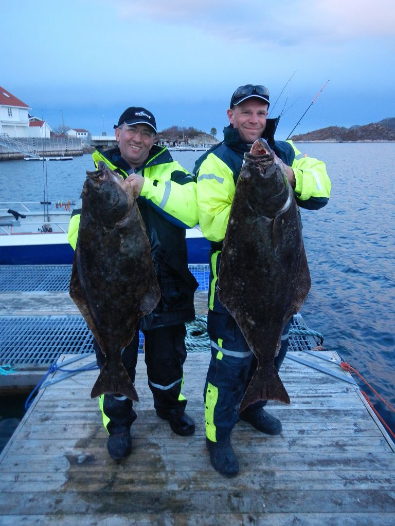 Auf Grund der stabilen Wetterlage versuchten wir unser Glück erneut auf die Bewohner die Tiefsee. „Leng“ und „Lumb“ sollte daher unser Tagesziel sein. Also machten wir uns auf zum Köderfische fangen. Dieses Vorhaben gestaltete sich allerdings sehr schwierig. Es dauerte bis ca. 13 Uhr bis das erste Boot mit Ercan, Thomas und Björn eine Portion Köhler zusammen hatte und Richtung der Tiefseestellen startete. Das zweite Boot mit Mark und Jens brach das Vorhaben erfolglos ab und machte sich lieber auf die Unterwasserberge nach Dorschen abzusuchen. Beide Vorhaben blieben aber bis ca. 18 Uhr völlig erfolglos. In der Tiefsee gab es nicht einen „Zupfer“ zu vermelden und gut besetzten Dorschberge vom Vortag waren wie leergefegt. Außer drei Dorschen und einem halbwegs vernünftigen Seelachs war einfach nichts zu holen. Da sieht man mal, dass sich die Bedingungen rund um Hitra von dem einen oder anderen Tag komplett ändern können. Wir hatten uns schon mit den leeren Fischkisten abgefunden, da hatte Mark noch eine gute Idee....eine bekannte Bucht anzusteuern. Bei jetzt mittlerweile stark auffrischenden Wind, bekam unser Ercan gleich einen heftigen Biss. Nach der ersten Flucht war klar: das konnte nur ein Heilbutt sein! Nach 20 Minuten Kampf lang dann ein Heilbutt von 104cm und 13,5 kg im Boot. Kaum war dieser Fisch sicher gelandet und vermessen, vermeldete auch schon Mark auf dem zweiten Boot einen weiteren Heilbutt Kontakt. Auch dieser Fisch konnte sicher gelandet werden und maß stolze 114cm und 17,5 kg, beide gefangen auf 16cm Gummifische. Weitere Driften konnten wir aber leider nicht mehr durchführen, der Wind frischte zu stark auf und wir mussten ja auch noch zurück! Zudem hatten wir ein Problem mit einem Motor am Boot. Das Fazit vom 5 Tag lautet: Unglaublich!!!!